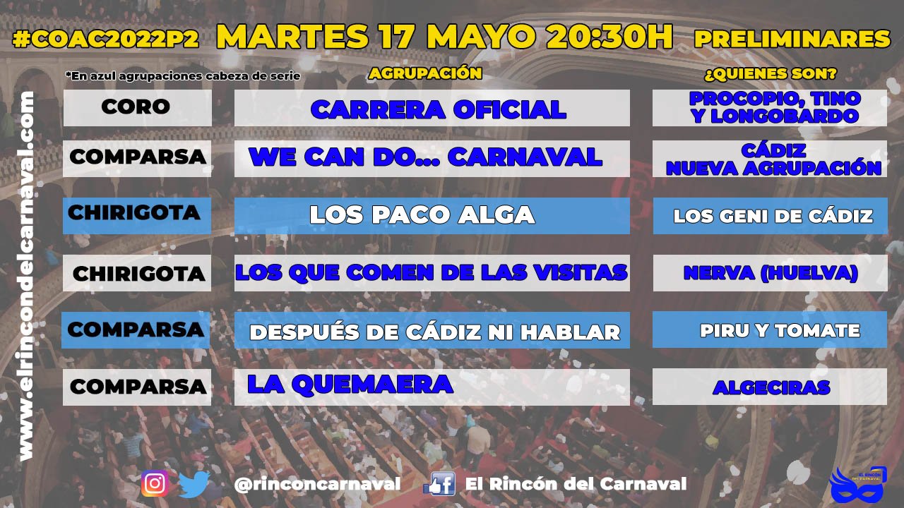 La segunda de las preliminares de adultos arrancará con el coro «Carrera Oficial», del trío que han formado Antonio Procopio, Salvador Longobardo y Tino Tovar.